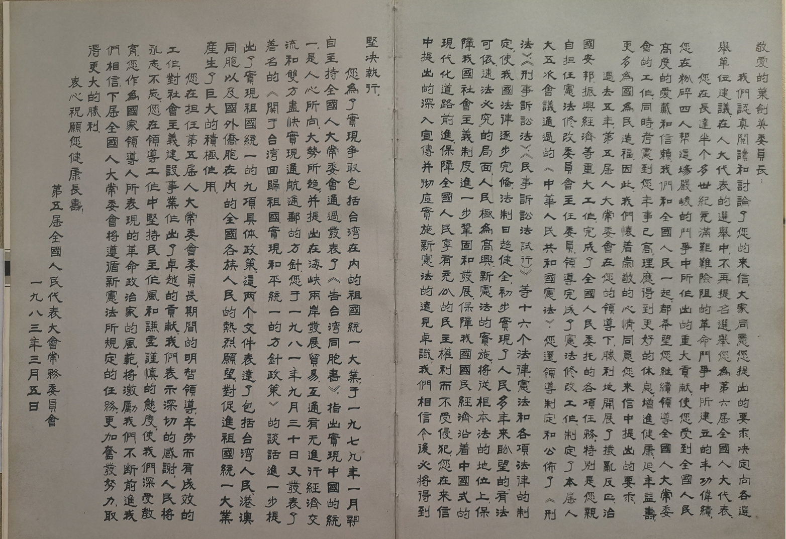 王遐举老先生代表全国人大常委会使用隶书抄写给叶剑英委员长的感谢信