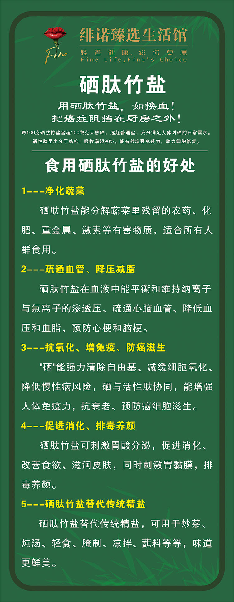 食用硒肽竹盐有的好处:1、竹盐适合所有人群,能分解菜里的农药、化肥、重金属、激素的残留;2、维持血液中纳离子与氯离子的渗透压,疏通心脑血管降低血压和血脂,预防心梗与脑梗的发生;3、参与体内酸碱平衡的调节,预防癌细胞的滋生;4、参与体内胃酸的生成,增强消化酶的产生,预防胃溃疡和胃癌的产生;5、在血液内能维持神经和肌肉的兴奋,促进血液循环,淡化血脂,促进尿液输出,增强皮肤润泽。礼盒装,1盒6包,260g/包。
