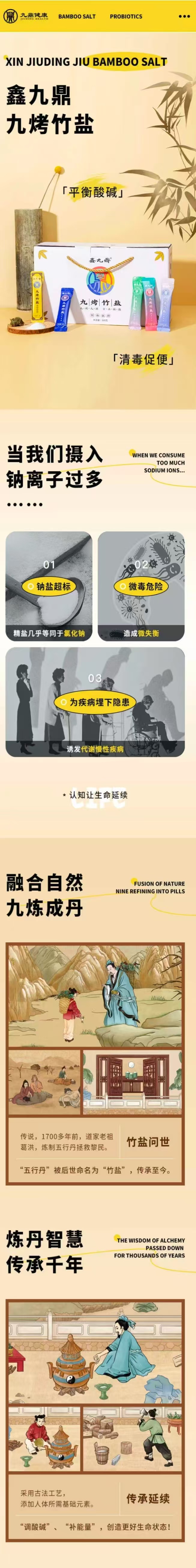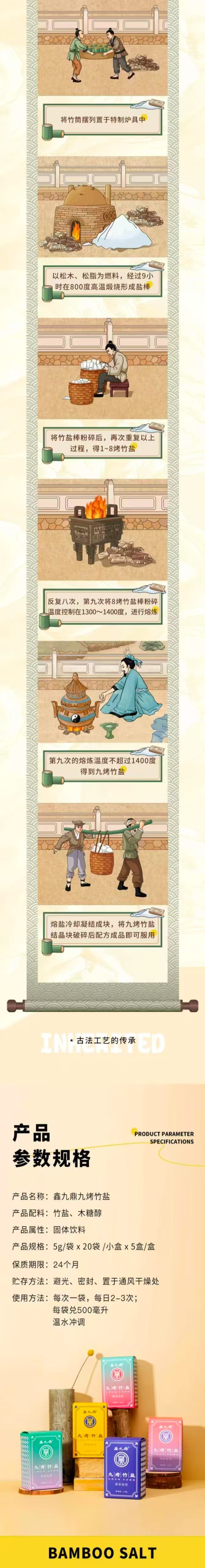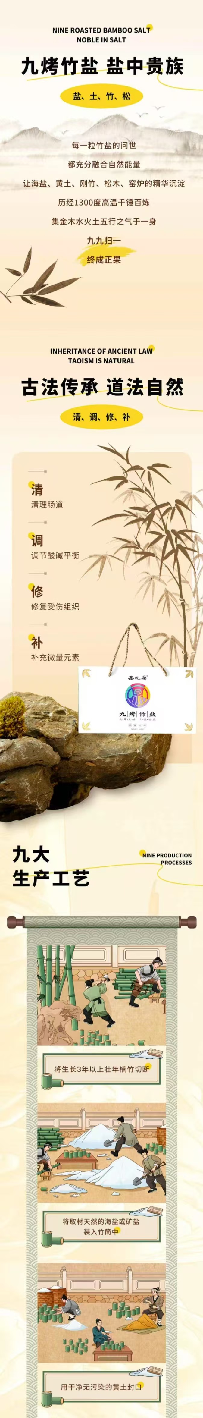 1.依据东方古老的阴阳五行原理,传统工艺烤制,使竹子,海盐,黄土,松木充分的融合,营养均衡,矿物质含量丰富。2.鑫九鼎竹盐呈灰色,咸鲜味,醇香,碱性,无任何化学食品添加剂,是一种符合现代人类日常生活和养生需要的自然健康食品。